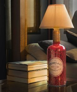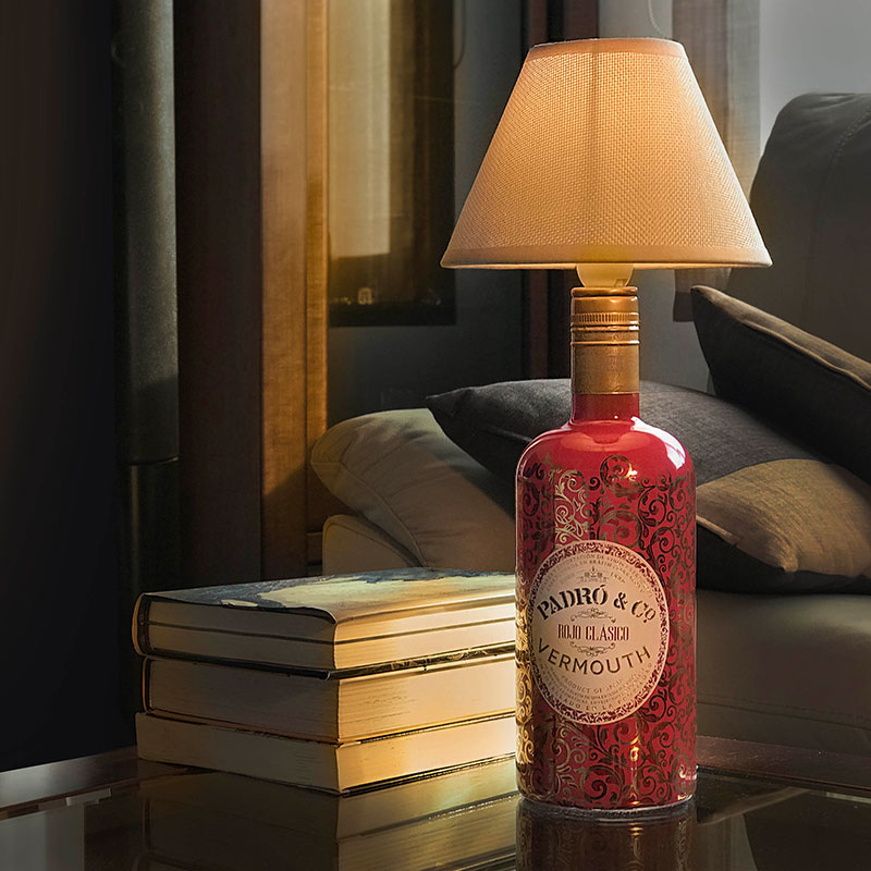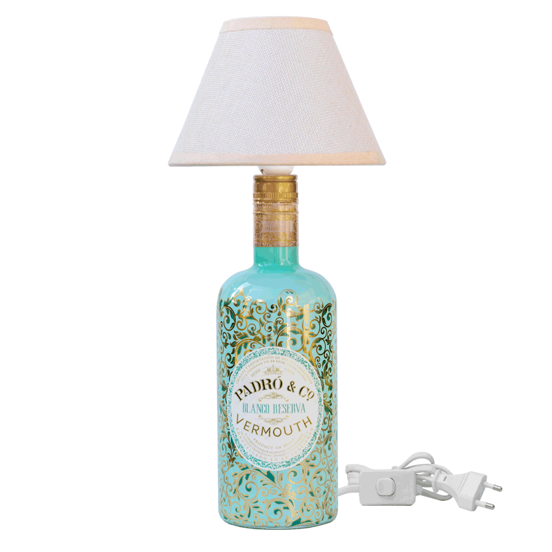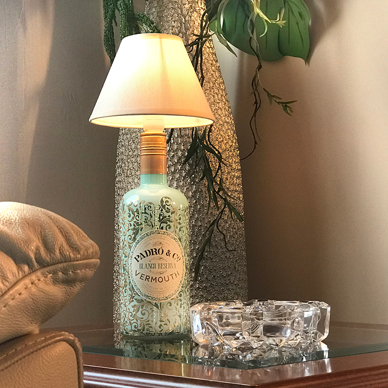Lámpara artesanal realizada con la botella reutilizada del Vermouth Padró & Co. Blanco Reserva y tulipa de tela.